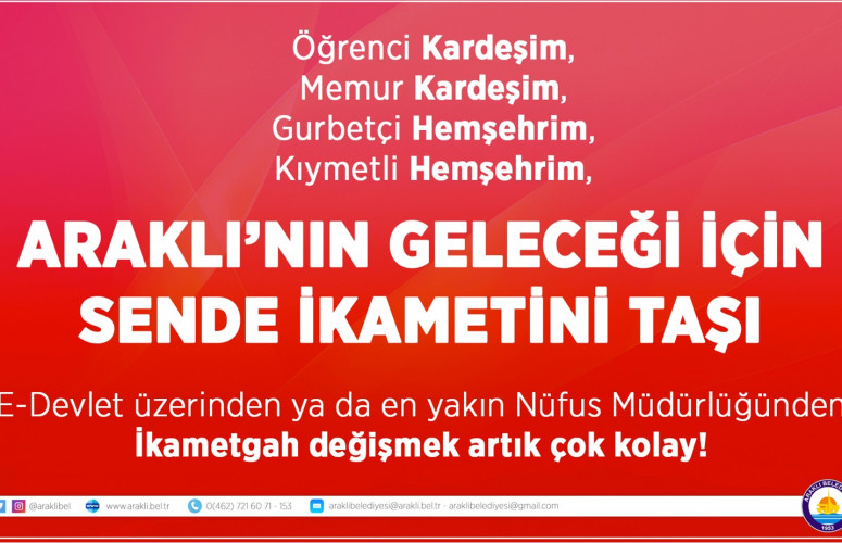 Araklı Belediye Başkanı Recep Çebi, ilçenin nüfusunu 50 binin üzerine çıkarmak amacıyla “Birinci ikameti Araklı’ya taşıyoruz” sloganıyla dikkat çekici bir kampanya başlattı. Yaz aylarında yerleşim yerinin nüfusunun 200 bini aştığı biliniyor.